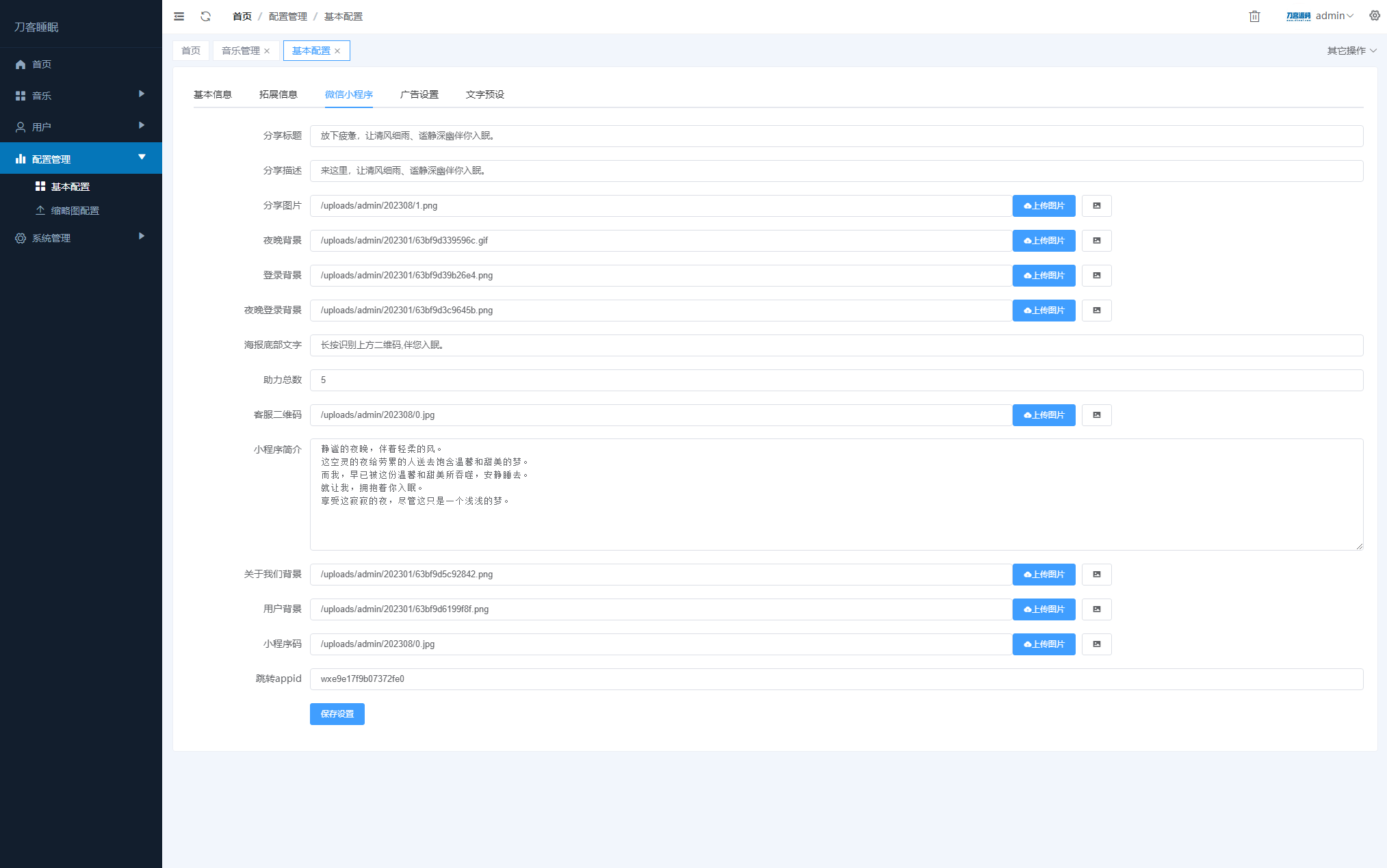 最近比较火的助眠小程序,前端采用vue,可以打包H5,APP,小程序等。