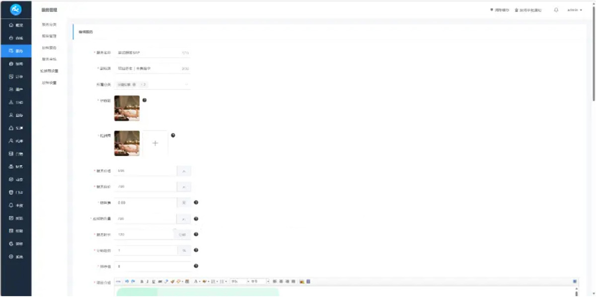项目展示包括技师选择、预约服务、优惠券、订单、意见功能、城市加盟功能、技师推荐、文章管理、业务员、渠道商、代理商等功能。