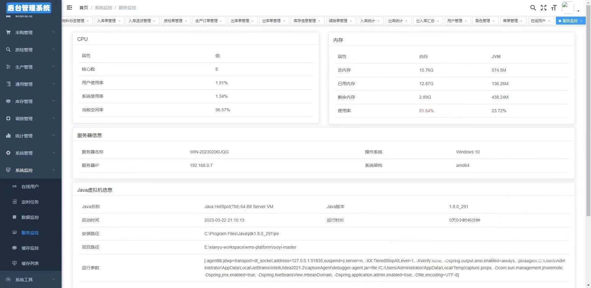 10、 系统监控:在线用户、定时任务、数据监控、服务监控、缓存监控、缓存列表